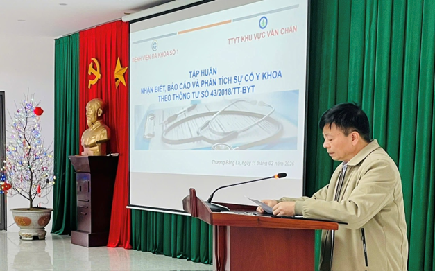 Nhằm nâng cao chất lượng cung cấp dịch vụ y tế, đảm bảo an toàn, phòng ngừa rủi ro trong quá trình khám điều trị, chăm sóc sức khỏe cho người bệnh cũng như cải tiến, nâng cao chất lượng khám chữa bệnh tại đơn vị, ngày 11 tháng 02 năm 2026, Trung tâm Y tế khu vực Văn Chấn phối hợp với Bệnh viện đa khoa số 1 tỉnh Lào Cai đã tổ chức hội nghị tập huấn về nhận biết, báo cáo và phân tích nguyên nhân sự cố y khoa (Theo thông tư 43/2018/TT-BYT ngày 26/12/2018 của Bộ Y tế).