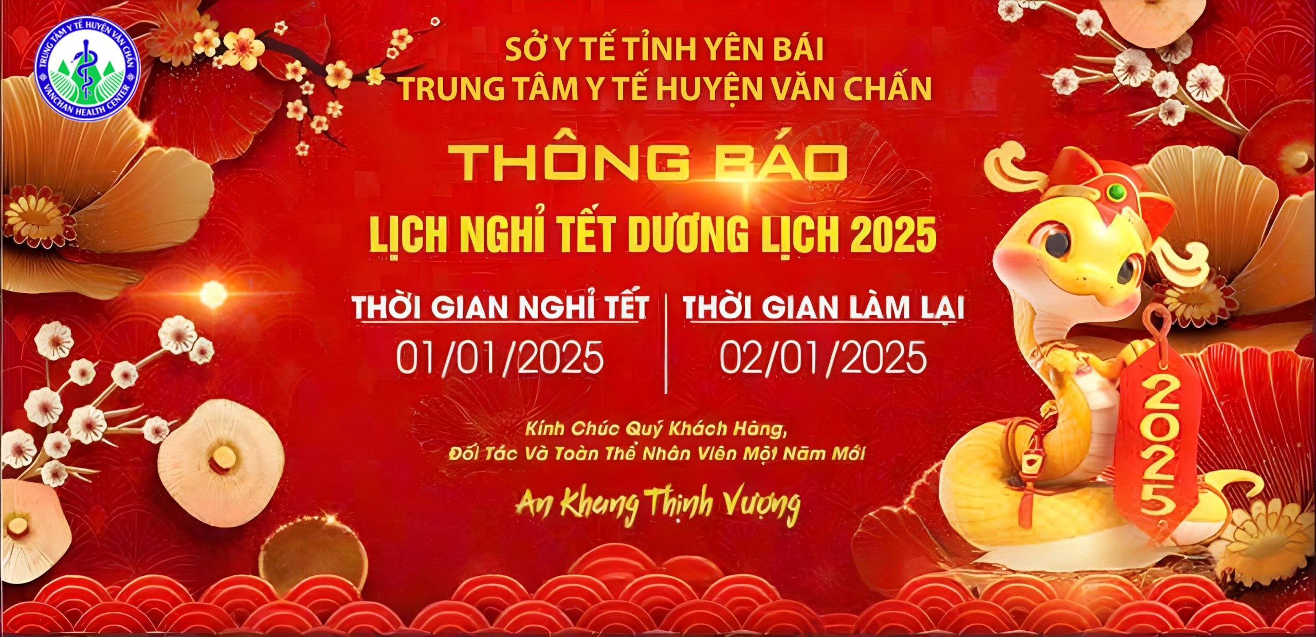 ♦ Trung tâm Y tế huyện Văn Chấn trân trọng thông báo lịch nghỉ tết dương lịch năm 2025: