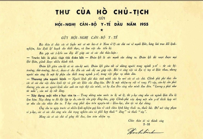 Trong Hội nghị cán bộ y tế được tổ chức từ ngày 21/2 đến 02/3/1955 tại Thủ đô Hà Nội, vào đúng ngày 27/02/1955 Chủ tịch Hồ Chí Minh đã gửi thư cho Hội nghị. Trong thư Người nhắc nhở cán bộ y tế 3 nội dung đó là: Phải thật thà đoàn kết; Thương yêu người bệnh như anh em ruột thịt của mình; Xây dựng nền y học nước nhà phải dựa trên nguyên tắc: Khoa học, dân tộc và đại chúng. Bức thư được đăng ở Báo Nhân dân số ra ngày 27/02/1955, ngắn gọn chỉ có 368 từ, súc tích, dễ hiểu.